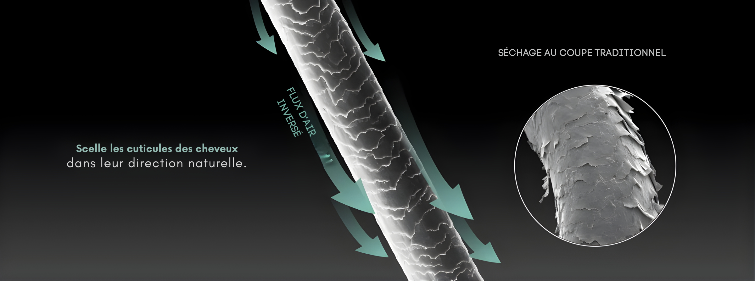 Le flux d'air à pression négative ferme et scelle les cuticules de la racine à la pointe et aligne les mèches, laissant vos cheveux scellés, protégés et brillants.